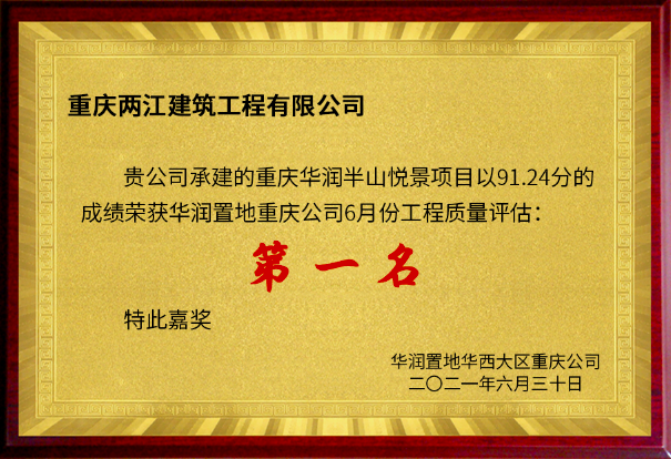 • 重庆华润半山悦景项目荣获华润置地重庆公司2021年6月份质量评估第一名